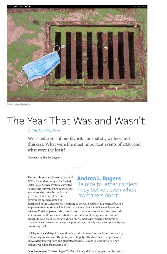 I have a piece in The Morning News. It was good to reflect on the last year. Here’s a link: https://themorningnews.org/article/2020-the-year-that-was-and-wasnt
